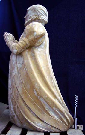 Stark ausgeprägte Schadbilder im Sockel und unteren Epitaphbereich führten zu einer Lastenverschiebung, so dass das Gewicht der beiden knienden Figuren ungleichmäßig und hauptsächlich nur noch über die Karyatiden in den Sockel geleitet wurde.